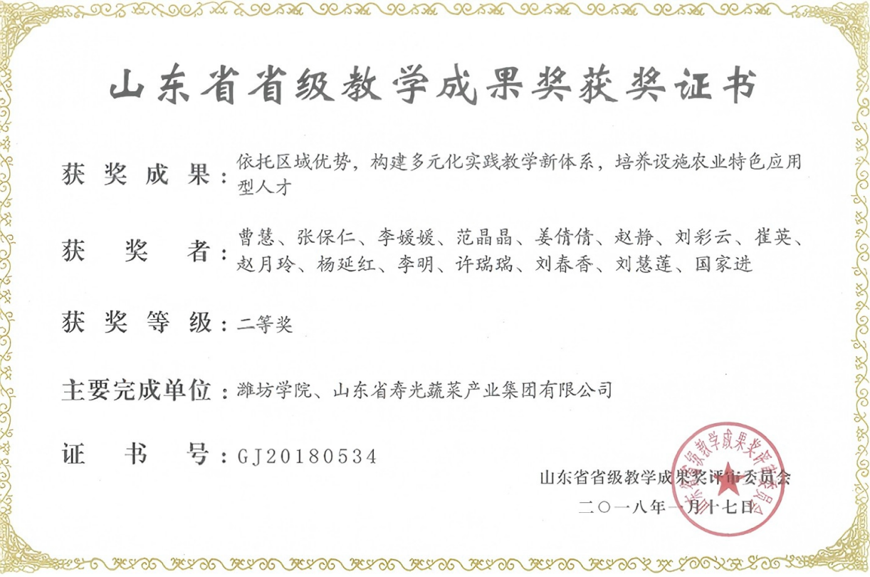 教学成果:省级 二等奖-依托区域优势,构建多元化实践教学新体系,培养设施农业特色应用型人才