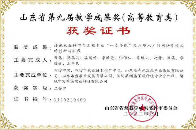 教学成果:省级 二等奖-设施农业科学与工程专业一专多能应用型人才协同培养模式的创新与实践