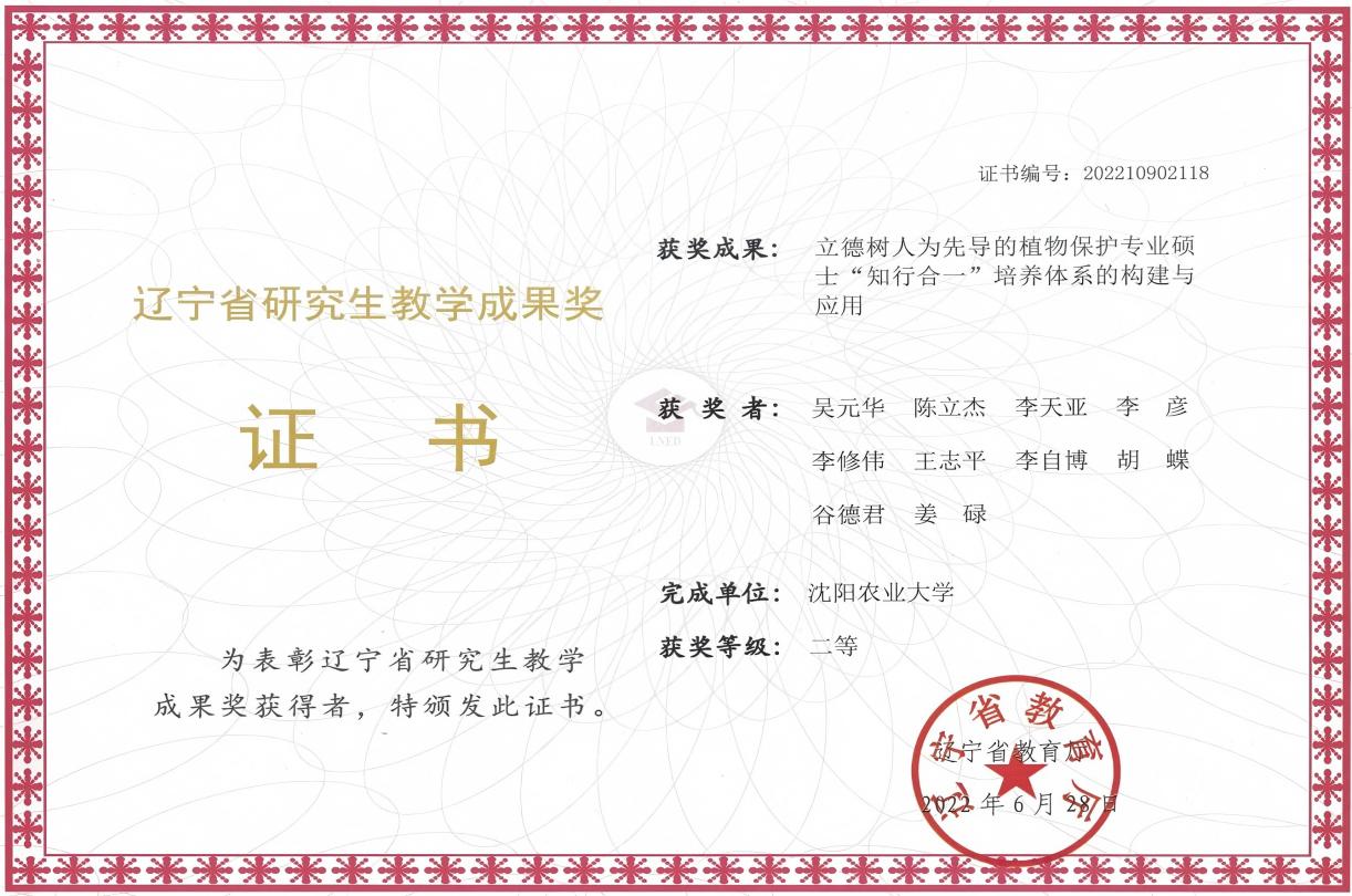 教学成果:省级 二等奖-立德树人为先导的植物保护专业硕士“知行合一”培养体系的构建与应用