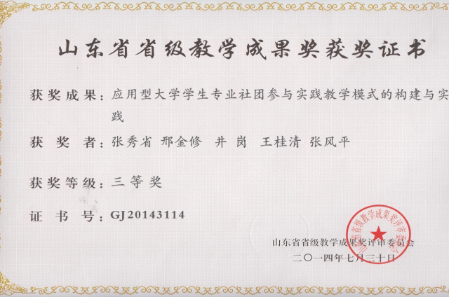 教学成果:省级 三等奖-应用型大学学生专业社团参与实践教学模式的构建与实践