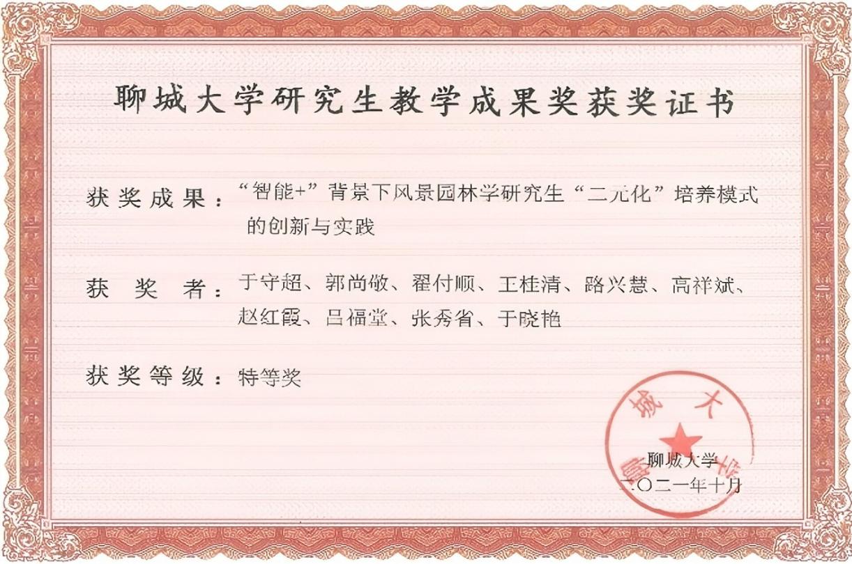 教学成果:校级 特等奖-“智能+”背景下风景园林学研究生“二元化培养模式的创新与实践