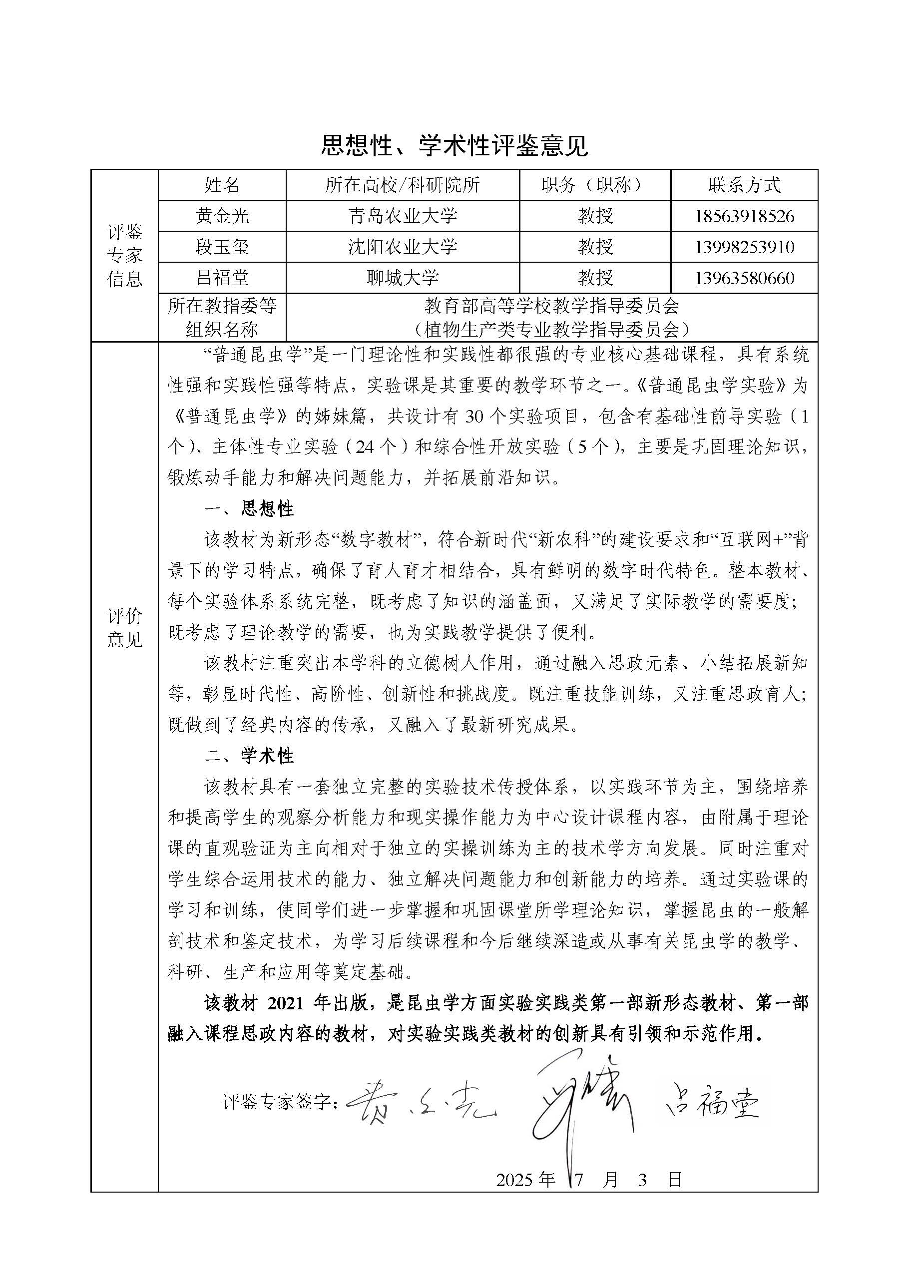植物生产类教指委委员对《普通昆虫学实验》教材的评价