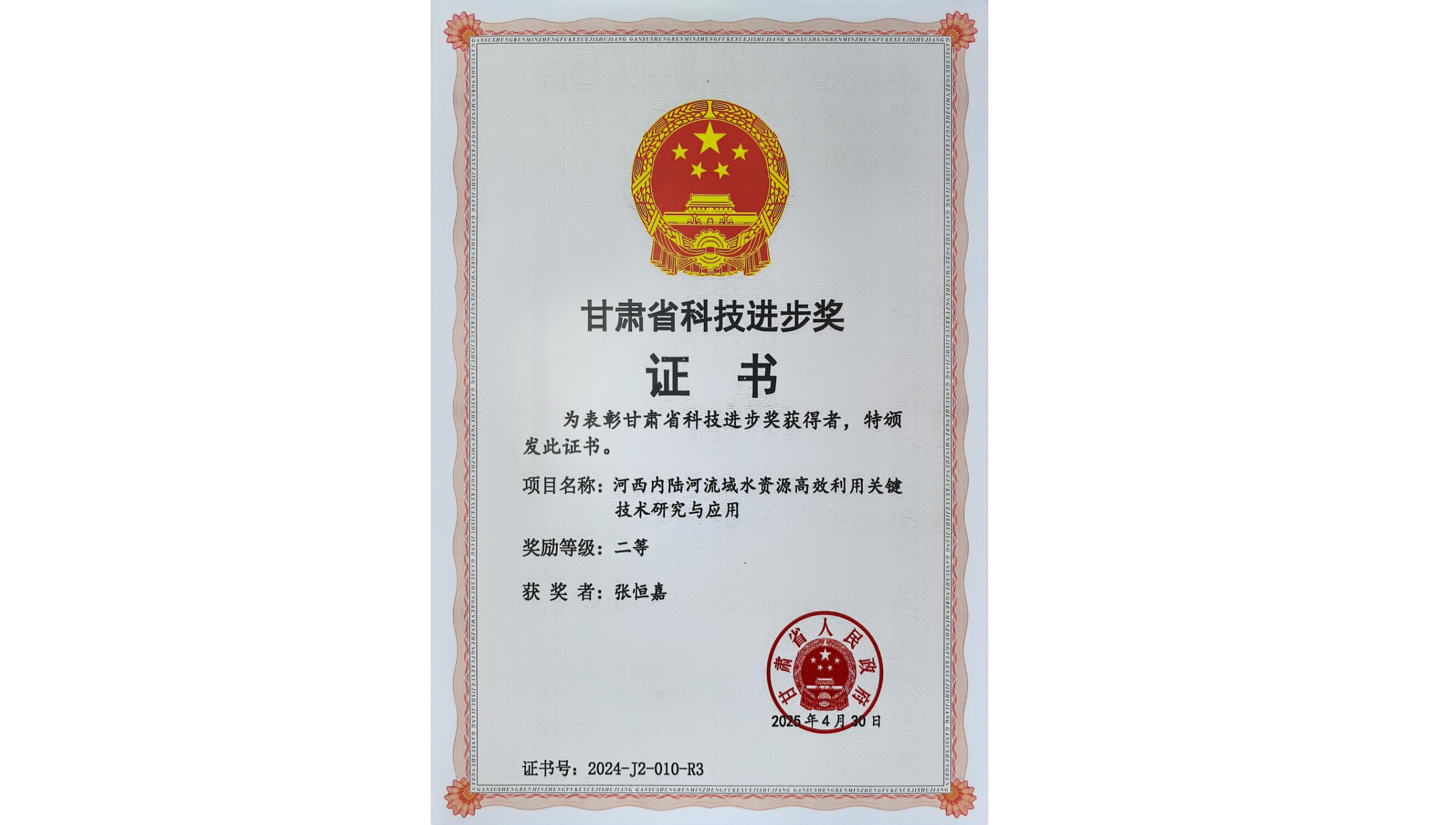 喜报!我院张恒嘉教授荣获甘肃省科技进步二等奖