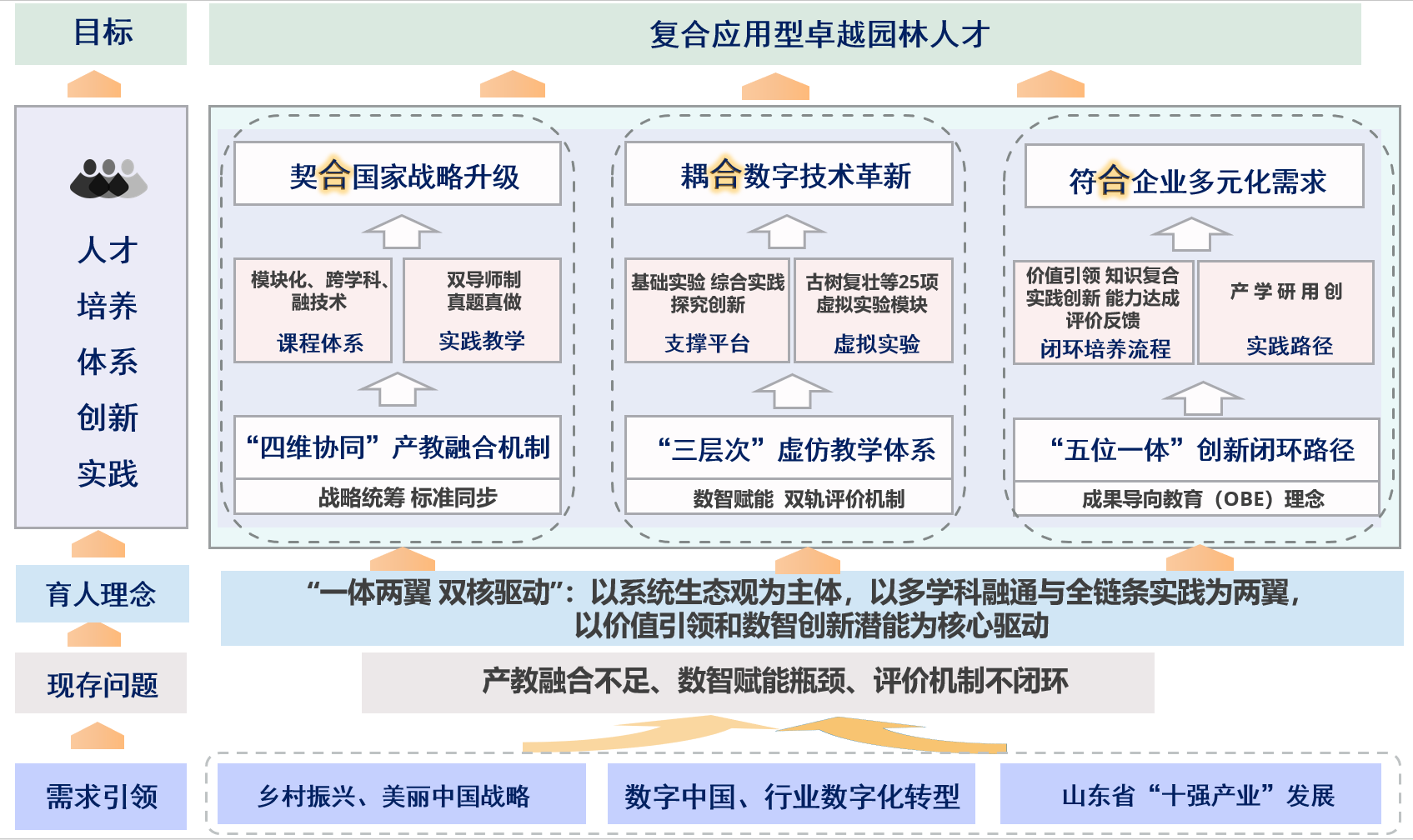 本成果面向国家“卓越农林人才教育培养计划2.0”以及行业数字化转型带来的新挑战,针对园林专业教育中产教融合机制不完善、数智技术融入瓶颈等核心问题,经过十年探索,构建了以“需求引领、产教融合、数智赋能”为核心的三维协同育人体系,并提出“一体两翼,双核驱动”人才培养理念,即以系统生态观为“一体”,多学科融通与全链条实践为“两翼”,以价值引领和数智创新能力为“双核驱动”,系统重构面向未来的复合应用型卓越园林人才培养新体系。