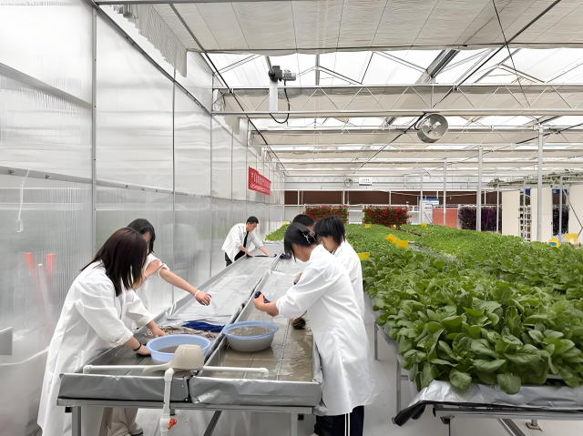 在水培蔬菜生产区,生菜、菠菜等叶菜采用营养液膜技术进行栽培,作物根系直接吸收循环流动的营养液。队员参与了营养液配制、水质检测等实践环节,在此过程中巩固了植物营养学与设施环境调控相关知识,并亲手完成蔬菜幼苗移栽作业,直观掌握水培技术的操作流程与生产特点,认识到无土栽培在节水节地、提质增产等方面的显著优势。