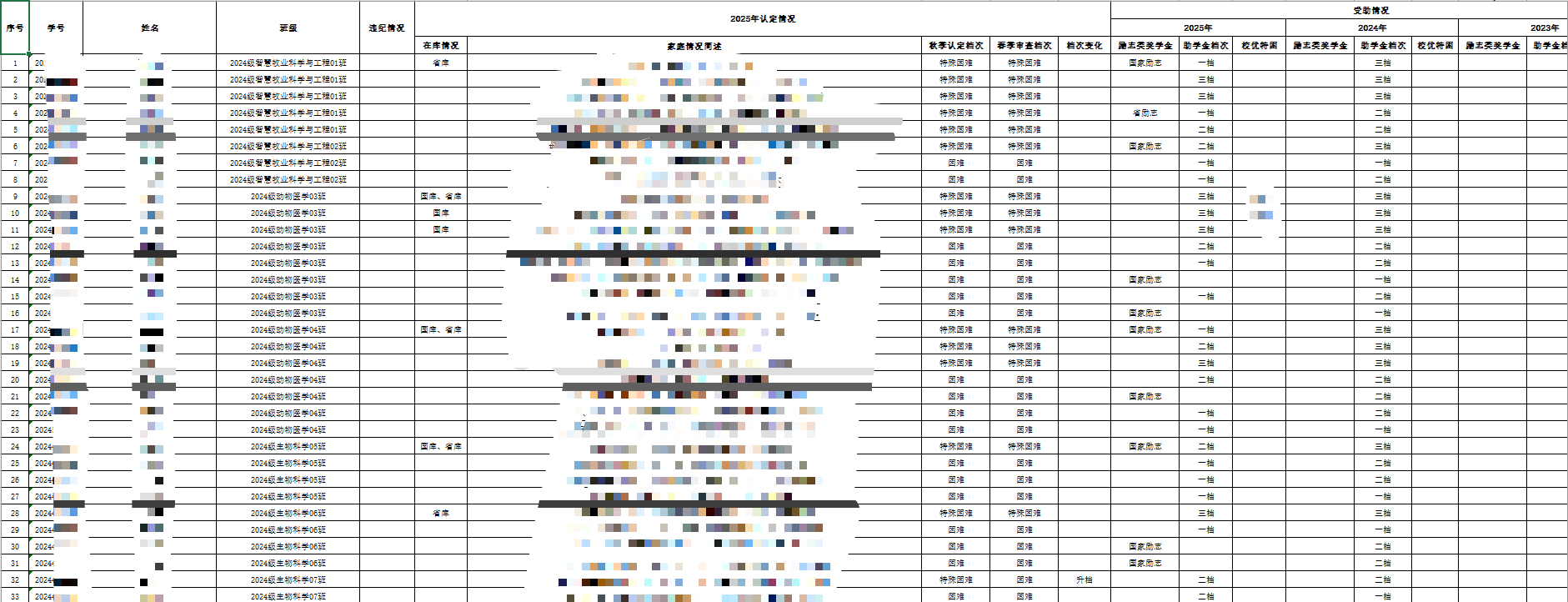 2.学年认定与审核情况:记录学生秋季学期的困难认定结果,以及春季学期的资格复核情况,确保资助资格的动态管理真实有效。
